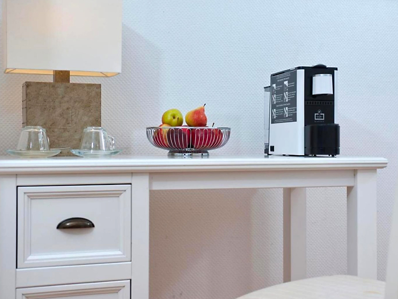 Sie genießen Ihren Aufenthalt in einer komfortablen, modern eingerichteten Suite mit getrenntem Wohn- und Schlafbereich, ausgestattet mit Boxspringbetten, Sofaecke mit Tisch, Schreibtisch und teilweise mit Balkon. Die dritte Person übernachtet im Wohnbereich.